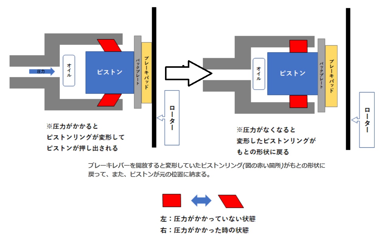 つまり、ゴムだけが元のカタチに戻ってしまいピストンはその場に置いて行かれてしまうワケです。ですからパッドは一定のスキマをキープしたままとなります。