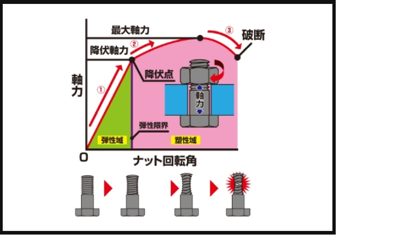①当初、軸力はナット回転角に比例して上昇します。(弾性域)