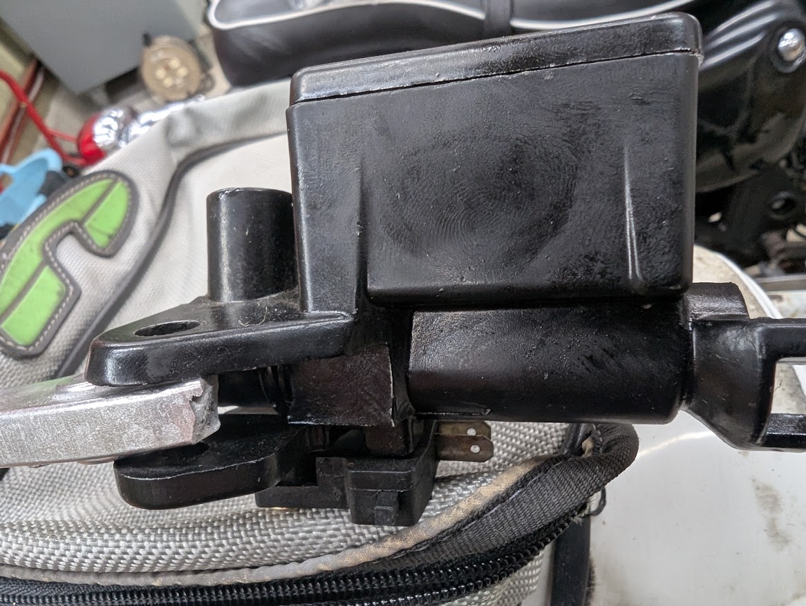 ◇ところがブレーキレバーの形状が合わず、スイッチを押す爪が邪魔に。DE、ブレーキランプを犠牲にしてレバーの爪を折ったか、無理に変形させた結果で折れたか。。。