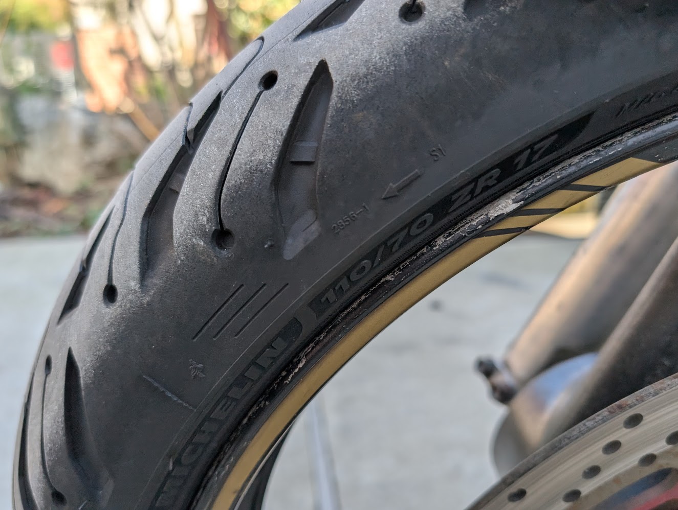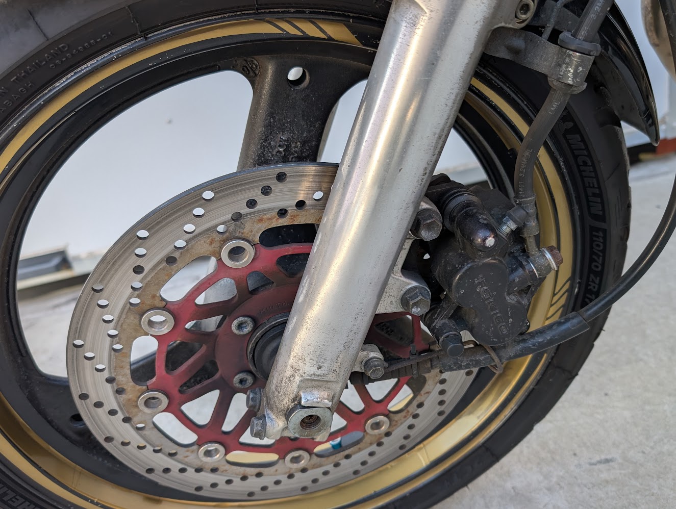 | フロントホイール | フロントタイヤ110/70R17 | H30年製、溝はあるが弾力なし | 交換 | IRC製 同サイズ ⇒現在はMICHELIN ロード6 |