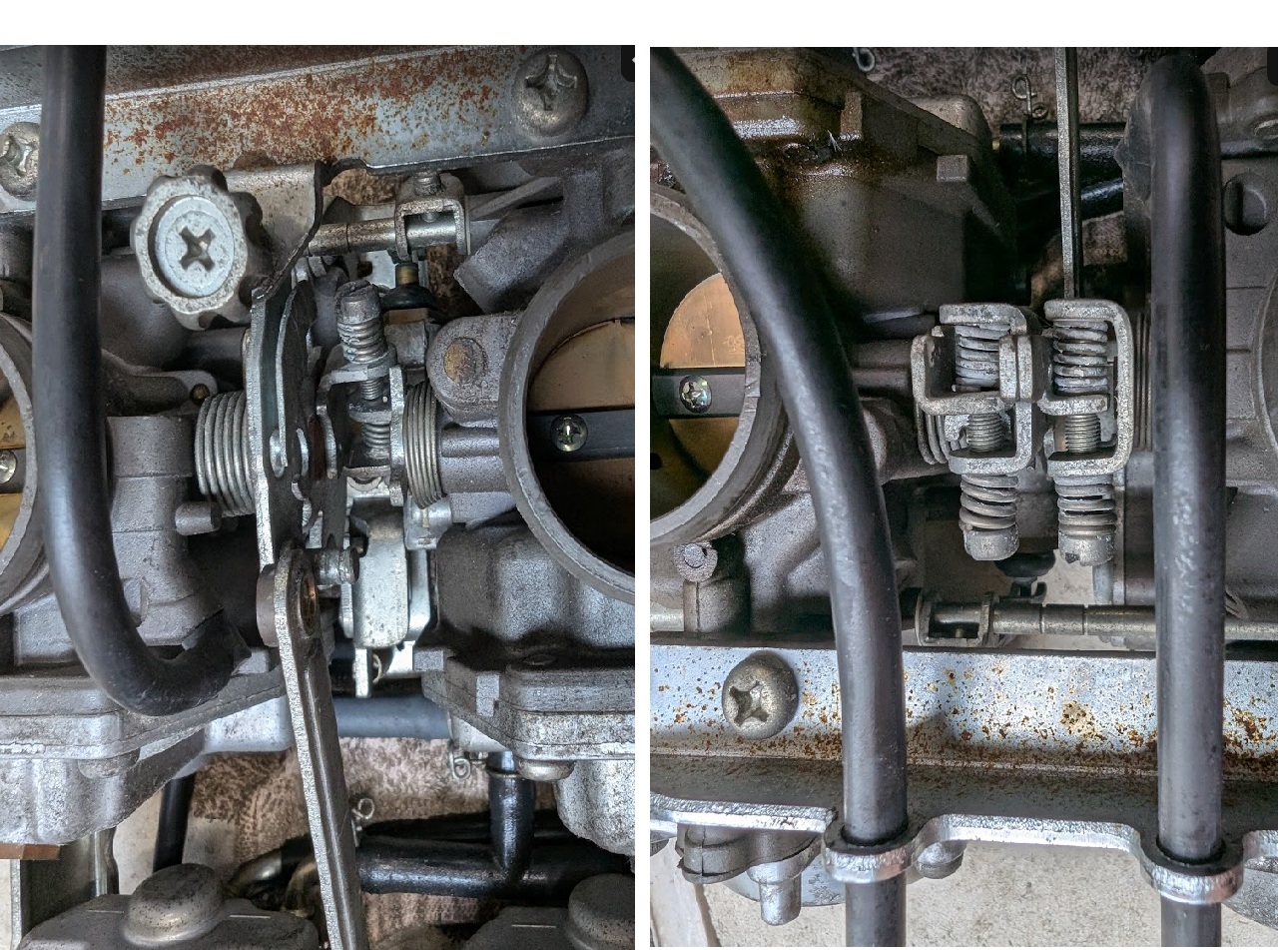 今回のキャブレターはV型4気筒エンジンに対応するよう不思議な連結をしています。単体キャブがストレートに並んでいないので、様々なリンクが複雑なのです。